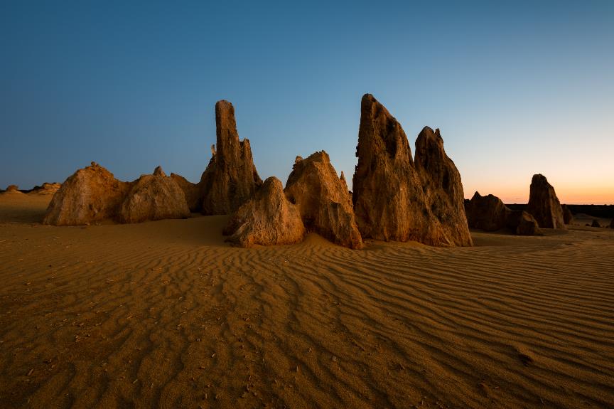 西澳的神奇之处就在于刚感叹完日出与银河的美丽,没过一会儿就看到了别处美丽的景象。图片里面的这些叫做尖峰石阵,这些石柱形成的原因是以前这里植物茂密,后来由于靠近海边,沙子逐渐被风吹上来覆盖到这里,久而久之植物枯萎。后来在经过风化和雨水侵蚀,较为松软的沙土变散,而之前被植物根部固定住的土质则慢慢石化成这样的石柱。
