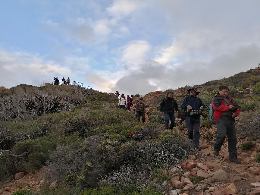 旭日东升,晨风拂面。第二天一早我们告别沙漠,正式开始踏浪之旅。沿着海南下一路向南,随着渐渐升高的地势我们看到了景观完全不一样的海岸风光,礁石丛生,惊涛拍岸。其中最著名的一处就是舒格洛夫岩(Sugarloaf Rock)。而下到海边的路并不好走,我们团队一行也折腾了一会。