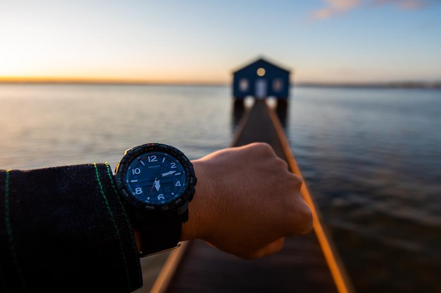 凌晨五点半准时被PRO TREK PRT-B50叫醒,除了闹钟功能以外,PRO TREK PRT-B50的蓄光和照明功能保证我们在光线不足的环境下能随时掌握时间。稍做洗漱后带上手表朝着小船坞进发,赶在日出时分到达,看到了金色的阳光洒在水面上。