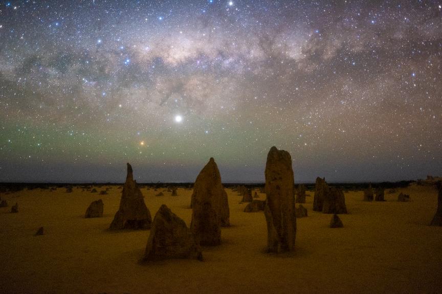 欣赏完日出后我们便开始向珀斯以北的南邦国家公园进发,这里有着一处外星地貌一般的景观—尖峰石阵,我已经记不得我来过这里多少次了,因为我觉得这是最适合拍星星的地方—远离城市光污染且地貌特殊,处于澳洲的银河处在最佳位置,银河核心居中且横跨天际,日落之后就可以看到,同行的小伙伴在出行前就被我安利了无数次澳洲星空,所以一路大家都很兴奋,两个小时的车程很轻松就度过了,当我们真的看到满眼的星空是我们觉得一切都是值得的。