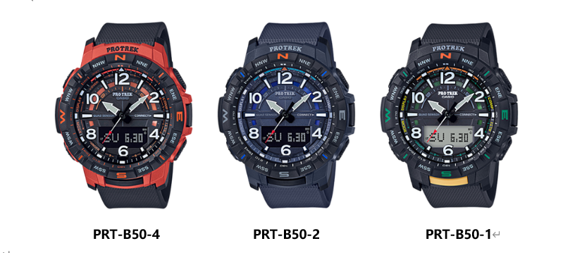 PRT-B50主要功能:*100米防水 *方位表圈 *双重LED照明 *液晶照明:高亮度自动LED照明 *紫外线自动LED照明 *四重感应器测量(方向、温度、气压/高度、计步功能 )*蓝牙连接功能 *世界时间(38个城市)*日出日落时间表示 *秒表(1/100秒)*倒计时*每日闹铃,整点响报 *全自动日历*12/24小时时制 *耐低温(-10℃)*指针闪避功能