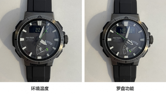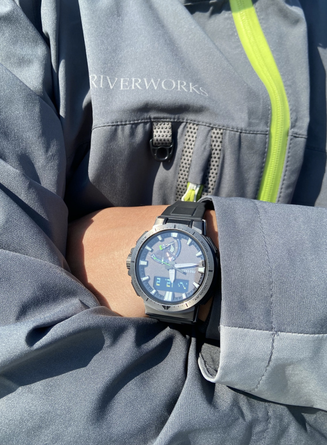 PRW-70Y-1PR中内置强悍的三重感应器能实时反馈周围地理信息,例如气压数值结合我们的出海经验能判断天气走势、罗盘功能让我们不迷失方向。太阳能则能免去手表没电的烦恼,六局电波让使用者无虑时区烦恼。另外手表还配备潮汐月龄、200米防水、捕鱼时间等功能让我们记忆十分深刻。