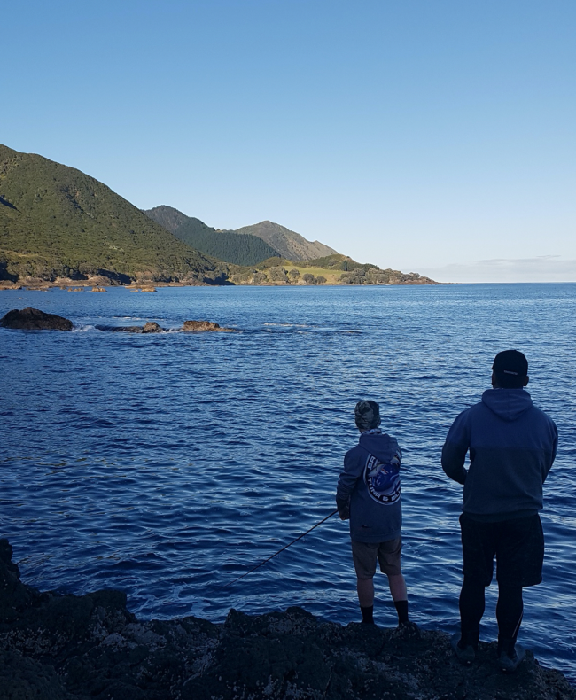 岸钓行程着实要比船钓辛苦太多。每天花时间最多的不是钓鱼,而是在不停地寻找钓点,再寻找钓点的期间需要背着20kg的装备走在新西兰的海岸线上。如果钓点地势比较特殊的情况下还需要攀岩绳、钢筋以及榔头等一些固定工具,例如在悬崖的钓点上我需要把钢筋敲进泥土里顺着绳子爬下去。